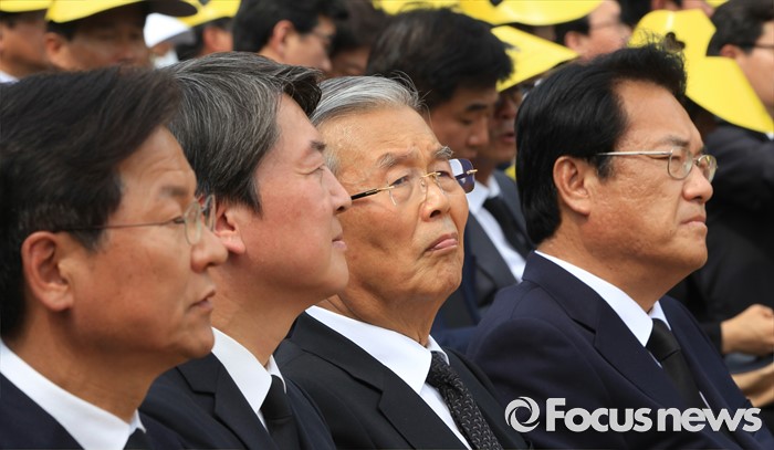 (김해=포커스뉴스) 23일 오후 경남 김해 봉하마을에서 엄수된 故 노무현 전 대통령 서거 7주기 추도식에 참석한 정진석(오른쪽부터) 새누리당 원내대표, 김종인 더불어민주당 비대위 대표, 안철수 국민의당 상임공동대표, 천정배 공동대표가 자리하고 있다.
