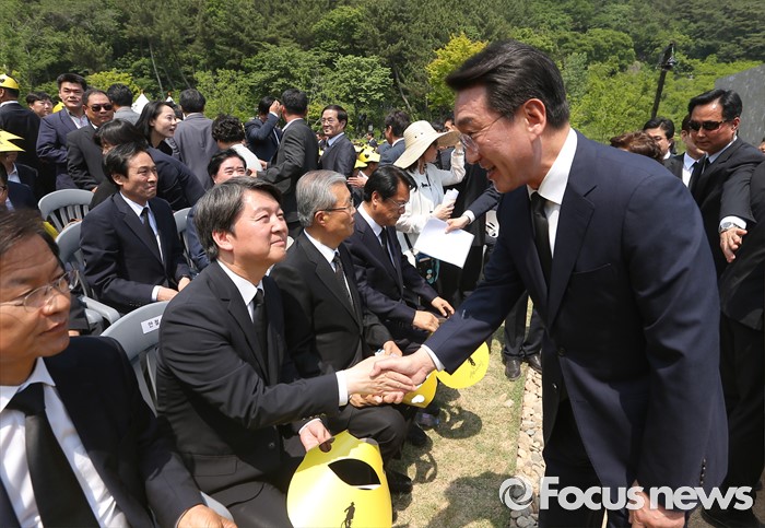 (김해=포커스뉴스) 23일 오후 경남 김해 봉하마을에서 엄수된 故 노무현 전 대통령 서거 7주기 추도식에 참석한 현기환(오른쪽 첫번째) 청와대 정무수석이 안철수(왼쪽 두번째) 국민의당 상임공동대표와 인사하고 있다.