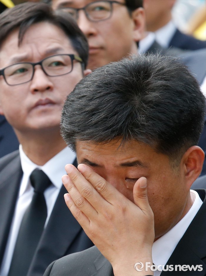 (김해=포커스뉴스) 23일 오후 경남 김해 봉하마을에서 엄수된 故 노무현 전 대통령 서거 7주기 추도식에 참석한 노 전 대통령의 장남 건호 씨가 눈물을 흘리고 있다.