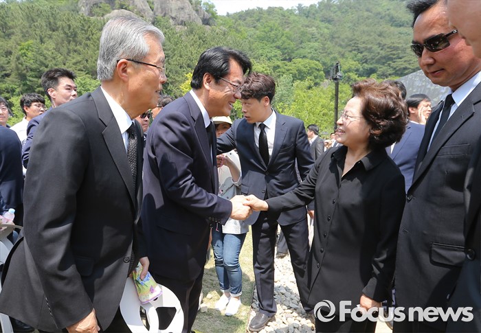 (김해=포커스뉴스) 23일 오후 경남 김해 봉하마을에서 엄수된 故 노무현 전 대통령 서거 7주기 추도식에 참석한 노 전 대통령 부인 권양숙(오른쪽) 여사와 정진석(가운데) 새누리당 원내대표가 인사하고 있다. 왼쪽은 김종인 더불어민주당 비대위 대표.