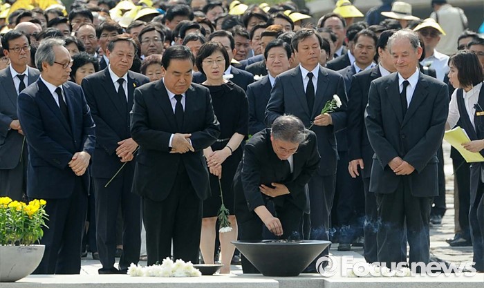 (김해=포커스뉴스) 23일 오후 경남 김해 봉하마을에서 엄수된 故 노무현 전 대통령 서거 7주기 추도식을 마친 뒤 문재인(앞줄 오른쪽 두번째) 더불어민주당 전 대표가 묘역 참배 및 헌화를 하고 있다.