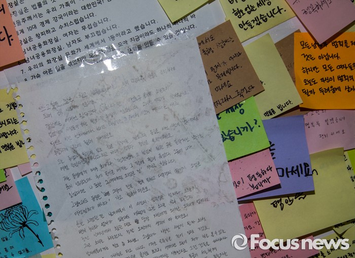 (서울=포커스뉴스) 23일 오후 서울 동작구 서울여성플라자 로비에 마련된 추모 전시장에 게시된 강남역 묻지마 살인 피해자 추모 기록물에 발자국이 찍혀 있다.