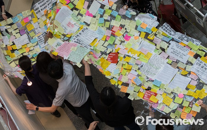(서울=포커스뉴스) 23일 오후 서울 동작구 서울여성플라자 로비에 마련된 추모 전시장에서 여성가족재단 직원들이 강남역 묻지마 살인 피해자 추모 기록물들을 게시하고 있다.