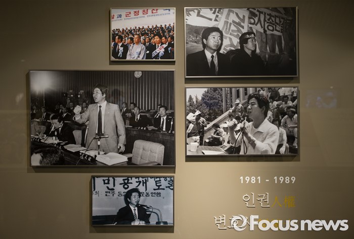 (김해=포커스뉴스)故 노무현 전 대통령 서거 7주기인 23일 오후 경남 김해시 진영읍 봉하마을 '추모의 집'에 노무현 전 대통령이 담긴 사진들이 걸려 있다.