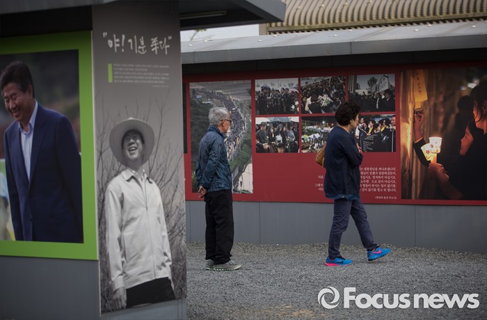 (김해=포커스뉴스)故 노무현 전 대통령 서거 7주기인 23일 오후 경남 김해시 진영읍 봉하마을 '추모의 집' 앞에서 추모객들이 노무현 전 대통령의 옛 모습이 담긴 사진들을 관람하고 있다.