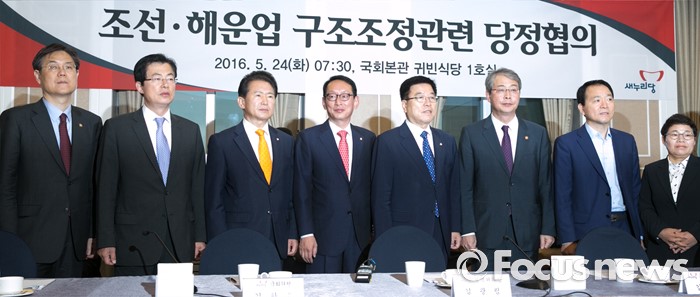 (서울=포커스뉴스) 24일 오전 서울 여의도 국회 귀빈식당에서 열린 조선·해운업 구조조정 관련 당정협의에 참석한 김광림 새누리당 정책위의장, 임종룡 금융위원장 등 참석자들이 취재진을 향해 포즈를 취하고 있다. 왼쪽부터 이관섭 산업통상자원부 1차관, 이만희 새누리당 원내부대표, 김한표 의원, 김도읍 원내수석부대표, 김광림 정책위의장, 임종룡 금융위원장, 성일종 원내부대표, 임이자 당선인.