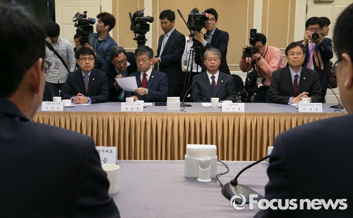 (서울=포커스뉴스) 24일 오전 서울 여의도 국회 귀빈식당에서 열린 조선·해운업 구조조정 관련 당정협의에 참석한 임종룡 금융위원장 등 참석자들이 김광림 새누리당 정책위의장의 발언을 듣고 있다. 왼쪽부터 고영선 고용노동부 차관, 최상목 기획재정부 1차관, 임 위원장, 이관섭 산업통상자원부 1차관.
