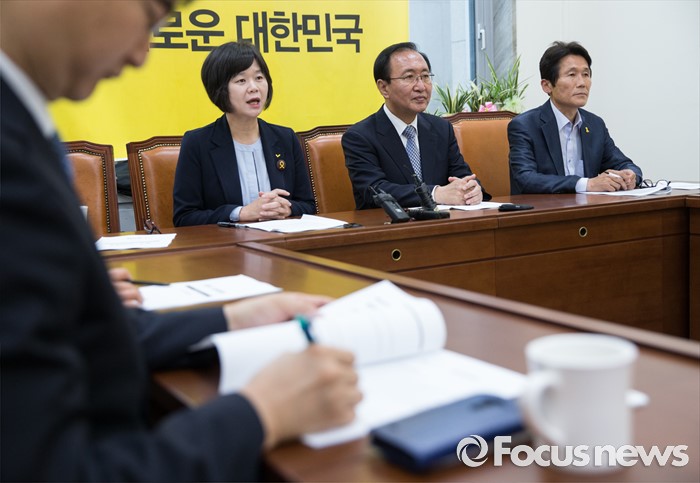 (서울=포커스뉴스) 노회찬 정의당(가운데) 원내대표가 참석한 가운데 이정미 정의당 당선인이 24일 오전 서울 여의도 국회에서 열린 당선자 총회에서 발언하고 있다. 왼쪽부터 이 당선인, 노 원내대표, 윤소하 당선인