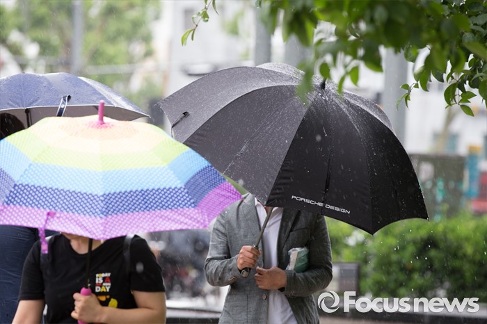 (서울=포커스뉴스) 전국이 흐리고 비가 내리는 24일 오전 서울 마포구 공덕역 인근 거리에서 시민들이 우산을 쓰고 지나가고 있다.