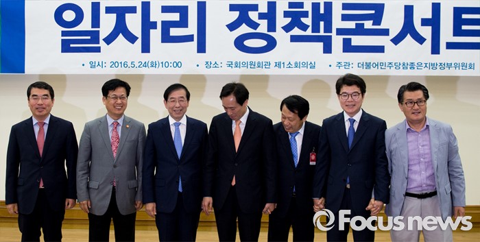 (서울=포커스뉴스) 우상호(가운데) 더불어민주당 원내대표와 박원순(왼쪽 세 번째) 서울시장을 비롯한 지자체장들이 24일 오전 서울 여의도 국회의원회관에서 열린 '지자체장 초청 일자리 정책 콘서트'에 참석해 사진촬영에 앞서 손을 잡고 있다.