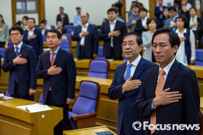 (서울=포커스뉴스) 우상호(오른쪽) 더불어민주당 원내대표와 박원순(오른쪽 두 번째) 서울시장을 비롯한 지자체장들이 24일 오전 서울 여의도 국회의원회관에서 열린 '지자체장 초청 일자리 정책 콘서트'에 참석해 국민의례를 하고 있다.