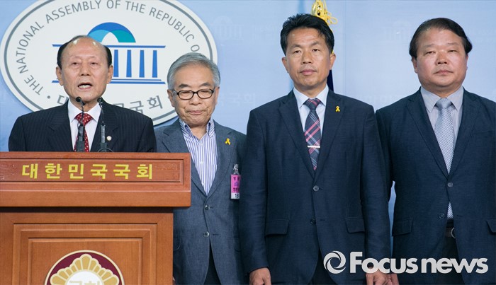(서울=포커스뉴스) 24일 오전 서울 여의도 국회 정론관에서 홍익표 더불어민주당 의원, 이정미 정의당 당선인, 윤종오 무소속 당선인과 6·15 남측위원회 등 각계 종교 및 시민사회 대표들이 남북관계 개선을 위한 공동 기자회견을 하고 있다. 왼쪽부터 이창복 6·15 남측위원회 상임대표의장, 김상근 전 민주평통 수석부의장, 윤 당선인, 신한용 개성공단기업협회 부회장.