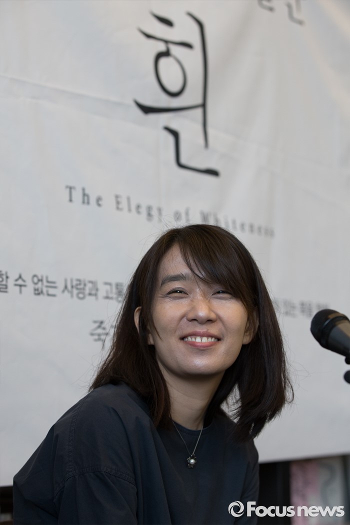 (서울=포커스뉴스) 소설' 채식주의자'로 세계 3대 문학상인 맨부커상을 수상한 한강이 24일 오전 서울 마포구 카페 꼼마에서 열린 신작소설 '흰' 출간 기자간담회에서 질문에 답하고 있다.