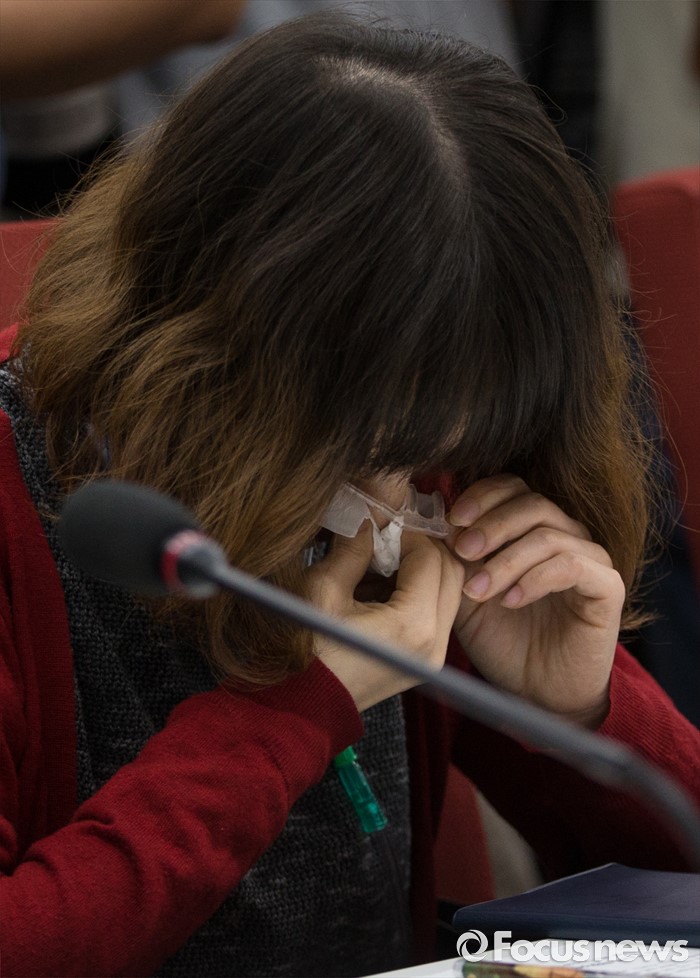 (서울=포커스뉴스) 가습기 살균제 피해자가 24일 오전 서울 여의도 국회 새누리당 원내대표실에서 열린 가습기살균제 피해자와 가족 모임 면담에 참석해 눈물짓고 있다.