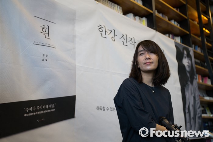 (서울=포커스뉴스) 소설' 채식주의자'로 세계 3대 문학상인 맨부커상을 수상한 한강이 24일 오전 서울 마포구 카페 꼼마에서 열린 신작소설 '흰' 출간 기자간담회에서 포즈를 취하고 있다.