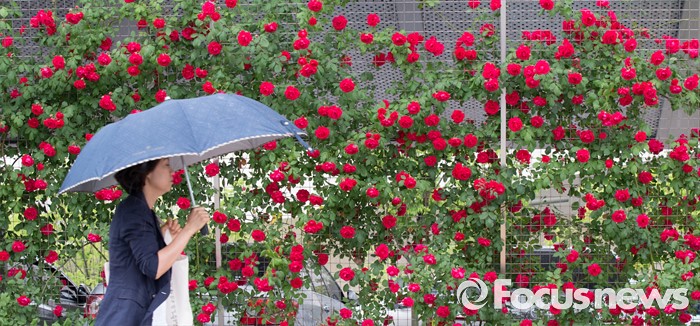 (세종=포커스뉴스) 전국적으로 비가 내린 24일 오후 세종시 세종도서관 울타리에 핀 장미 사이로 시민들이 우산을 쓰고 지나고 있다.