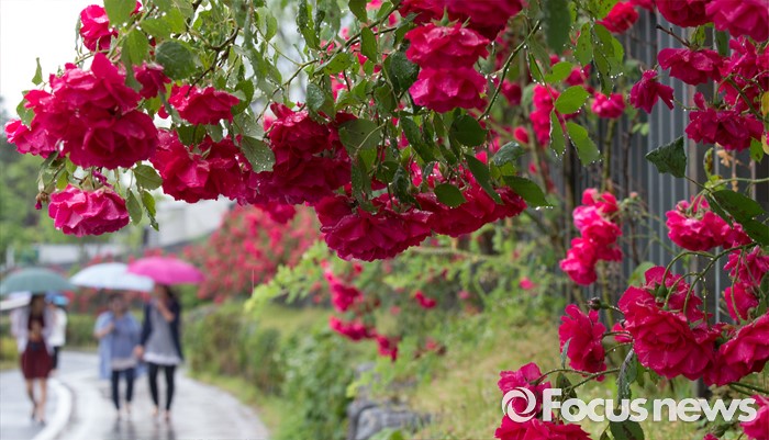 (세종=포커스뉴스) 전국적으로 비가 내린 24일 오후 세종시 정부세종청사 국무총리실 울타리에 핀 장미 사이로 청사 직원들이 우산을 쓰고 지나고 있다.