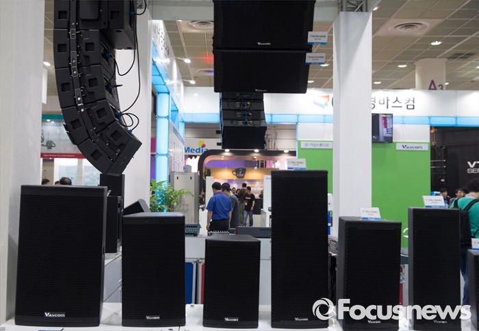 (서울=포커스뉴스) 24일 오전 서울 강남구 코엑스에서 열린 '제26회 국제 방송·음향·조명기기 전시회'의 한 부스에 전시된 스피커들.