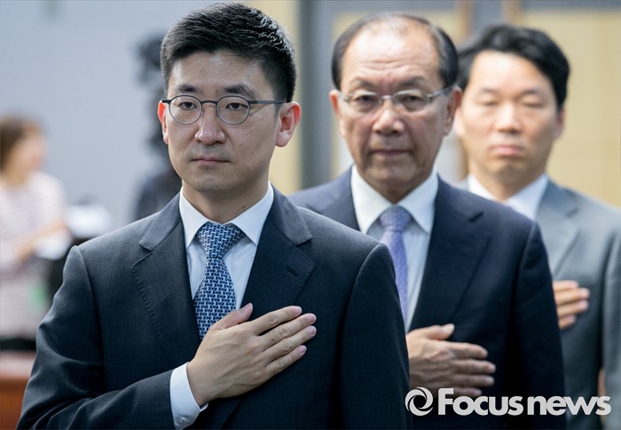 (서울=포커스뉴스) 24일 오후 서울 여의도 국회 의원회관에서 열린 국회선진화법 평가와 발전 방안 토론회에 참석한 김세연(왼쪽부터), 황우여 새누리당 의원, 김병관 더불어민주당 당선인이 국기에 대한 경례를 하고 있다.