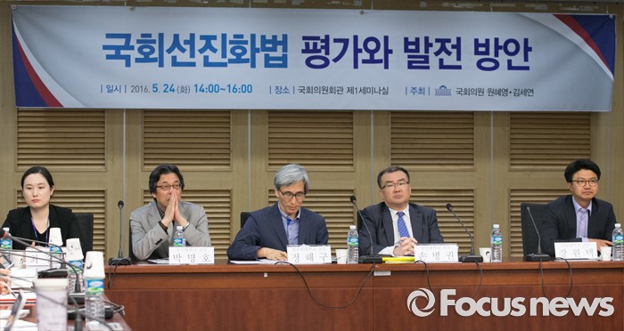 (서울=포커스뉴스) 24일 오후 서울 여의도 국회 의원회관에서 열린 국회선진화법 평가와 발전 방안 토론회에 참석한 패널들이 토론을 준비하고 있다. 왼쪽부터 최정인 국회입법조사처 입법조사관, 박명호 동국대 교수, 정해구 성공회대 교수, 손병권 중앙대 교수, 강원택 서울대 교수.