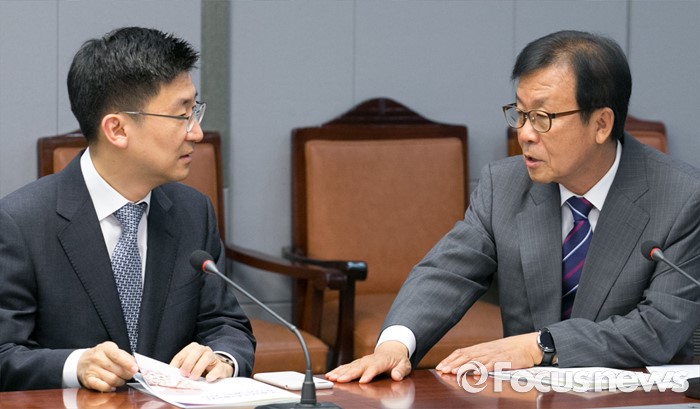 (서울=포커스뉴스) 24일 오후 서울 여의도 국회 의원회관에서 열린 국회선진화법 평가와 발전 방안 토론회에 참석한 김세연(왼쪽) 새누리당 의원과 원혜영 더불어민주당 의원이 대화하고 있다.