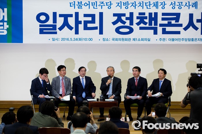 (서울=포커스뉴스) 김종인(왼쪽 세 번째) 더불어민주당 비상대책위 대표가 24일 오전 서울 여의도 국회의원회관에서 열린 '더불어민주당, 지자체장 초청 일자리 정책 콘서트'에 참석해 발언 하고 있다.