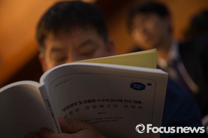 (서울=포커스뉴스) 24일 오후 서울 중구 포스트타워에서 열린 부정청탁 및 금품 등 수수 금지에 관한 법률(일명 김영란법) 입법예고안에 대한 공청회에 참석한 시민들이 안내책자를 보고 있다.