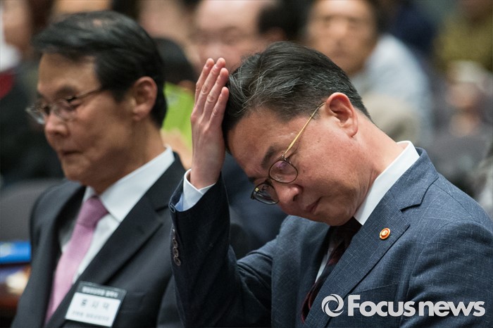 (서울=포커스뉴스) 천안함 피격사건을 계기로 5·24 대북제재 조치가 취해진 지 6년이 되는 날인 24일 오후 서울 중구 프레스센터에서 열린 '통일공감포럼 발족식 및 통일공감대화'에 참석한 홍용표(오른쪽) 통일부 장관이 머리를 만지고 있다.