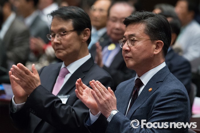 (서울=포커스뉴스) 천안함 피격사건을 계기로 5·24 대북제재 조치가 취해진 지 6년이 되는 날인 24일 오후 서울 중구 프레스센터에서 열린 '통일공감포럼 발족식 및 통일공감대화'에 참석한 홍용표(오른쪽) 통일부 장관과 홍사덕 민화협 대표상임의장이 축사하고 있다.