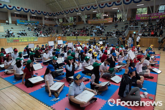 (서울=포커스뉴스) 24일 오후 서울 강북구 신일중학교 체육관에서 열린 근현대사기념관 개관 기념 '역사 골든벨'에 참석한 학생들이 본선 골든벨 퀴즈를 풀고 있다.