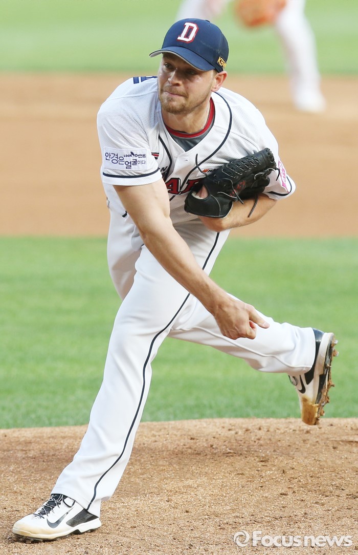(서울=포커스뉴스) 24일 서울 잠실구장에서 열린 2016프로야구 kt-두산 경기에서 1회초 두산 선발투수 보우덴이 투구하고 있다.