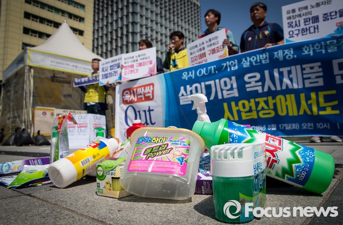 검찰은 당시 조 교수가 해당 보고서 결과를 조작했을 것으로 보고 수사를 진행하고 있다.17일 오전 서울 광화문광장에서 열린 '옥시 불매, 사업장 옥시 OUT' 선언 기자회견장에 옥시 제품들이 내팽개쳐저 있다. 2016.05.17 양지웅 기자