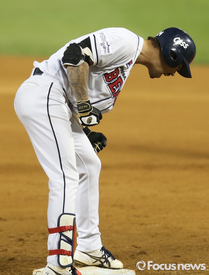 (서울=포커스뉴스) 24일 서울 잠실구장에서 열린 2016프로야구 kt-두산 경기 7회말 무사 만루에서 두산 오재원이 동점 2타점 중전 안타를 치고 1루에서 환호하고 있다.