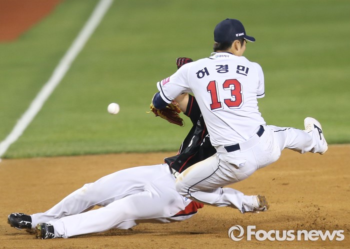 (서울=포커스뉴스) 24일 서울 잠실구장에서 열린 2016프로야구 kt-두산 경기 6회초 1사 1,3루에서 kt 전민수의 2루수 옆 안타때 1루주자 박경수가 3루로 뛰다 두산 3루수 허경민과 충돌하고 있다.