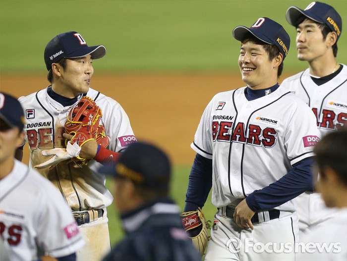 (서울=포커스뉴스) 24일 서울 잠실구장에서 열린 2016프로야구 kt-두산 경기에서 kt와 역전 재역전하는 승부 끝에 승리해 시즌 30승에 선착한 두산 민병헌과 허경민이 밝은 표정으로 기쁨을 나누고 있다.