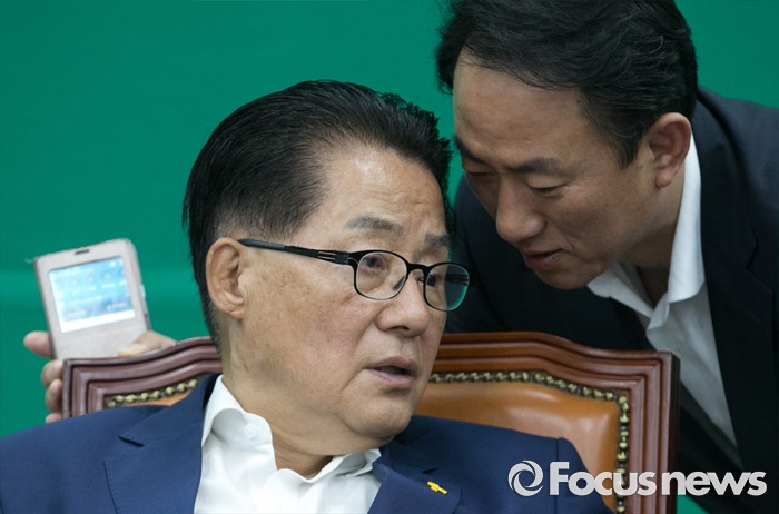 (서울=포커스뉴스) 25일 오전 서울 여의도 국회에서 열린 국민의당 최고위원회의에 참석한 박지원(왼쪽) 원내대표와 김명진 원내대표비서실장이 대화하고 있다.