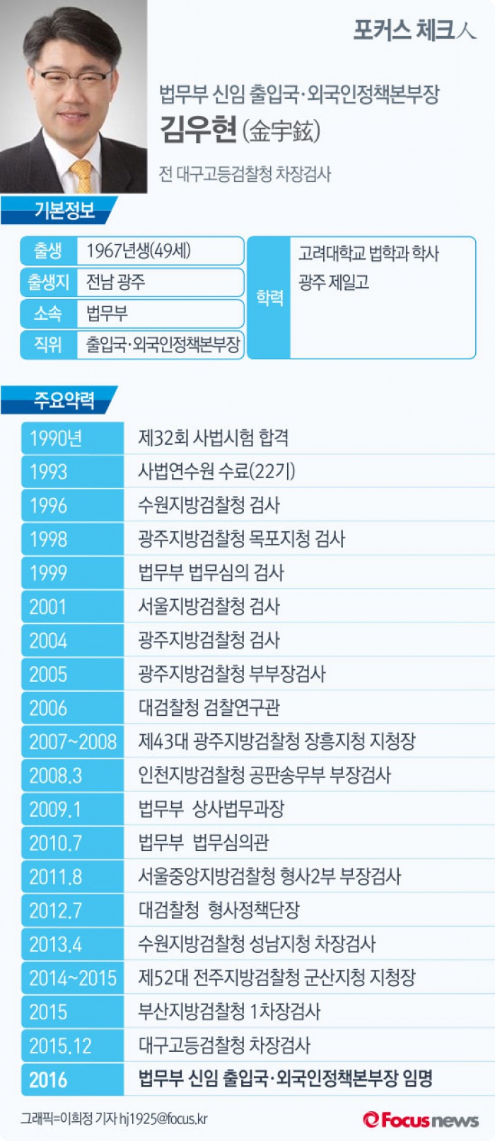 | △ [그래픽] 포커스 체크人 김우현 법무부 신임 출입국·외국인정책본부장 |