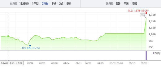아이오케이는 이날 오전 9시54분 현재 전일 대비 22.64%(240원) 상승한 1300원에 거래되고 있다.