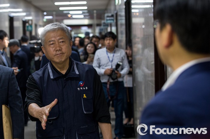 이들은 앞으로 전국공공산업노동조합연맹과 전국금속노동조합연맹과 함께 정부와 기업에 구조조정에 대한 책임을 묻고 국회에 문제 해결에 앞장설 것을 촉구할 방침이다.(서울=포커스뉴스) 김동만 한국노총 위원장이 3일 오후 서울 여의도 국회에서 김종인 더불어민주당 비상대책위 대표와 간담회를 하기 위해 당대표실로 향하고 있다. 2016.05.03 강진형 기자