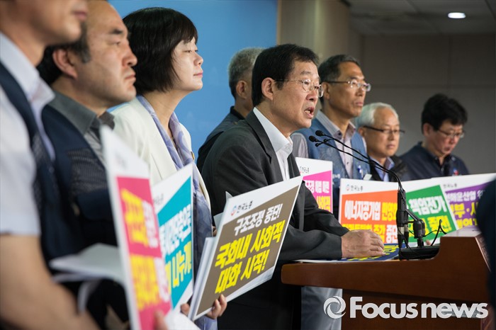 (서울=포커스뉴스) 이용득(가운데) 더불어민주당 국회의원 당선인이 25일 오전 서울 여의도 국회에서 열린 '구조조정 해법 마련 국회 내 사회적 대화 촉구 기자회견'에서 발언하고 있다.