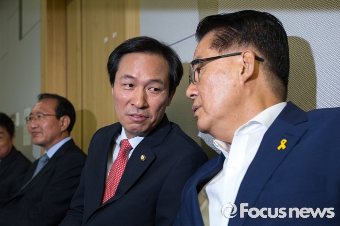 (서울=포커스뉴스) 우상호(오른쪽 두 번째) 더불어민주당 원내대표와 박지원(오른쪽) 국민의당 원내대표가 25일 오전 서울 여의도 국회의원회관에서 열린 '공영언론 지배구조 개선 위한 20대 국회의 역할과 과제 토론회'에 참석해 대화를 나누고 있다.