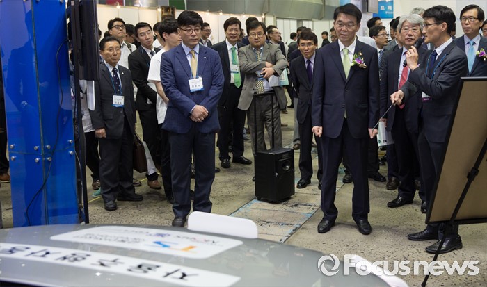 (서울=포커스뉴스) 25일 오전 서울 강남구 코엑스에서 열린 국토교통부 주최'2016 국토교통기술대전'에 참여한 강호인(앞줄 오른쪽 두번째) 국토교통부 장관이 자율주행자동차에 대한 설명을 듣고 있다.