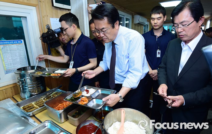 (서울=포커스뉴스) 정진석 새누리당 원내대표가 25일 오후 서울 여의도 당사 앞 경비 의경대를 격려차 방문해 식사를 하기 위해 배식을 하고 있다.