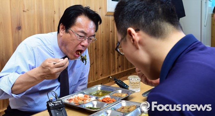 (서울=포커스뉴스) 정진석 새누리당 원내대표가 25일 서울 여의도 당사 앞 경비 의경대를 격려차 방문해 식사를 하고 있다.