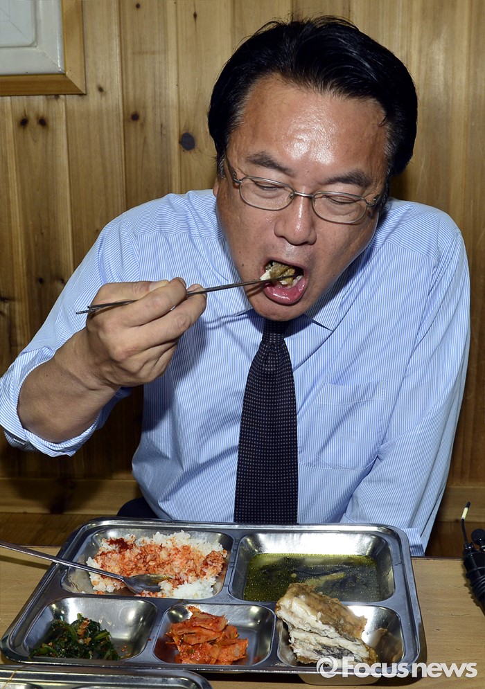 (서울=포커스뉴스) 정진석 새누리당 원내대표가 25일 서울 여의도 당사 앞에서 근무하는 경비중대를 격려 방문해 의경들과 오찬을 하고 있다.
