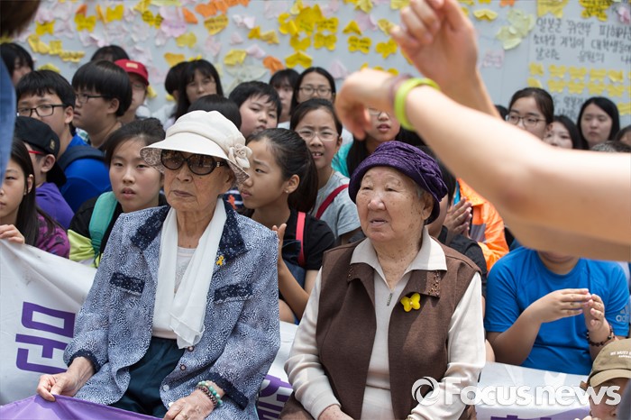 (서울=포커스뉴스) 25일 오전 서울 종로구 옛 일본대사관 앞에서 열린 '제1232차 일본군 위안부 문제해결을 위한 정기 수요시위'에 참석한 김복동(왼쪽), 길원옥 할머니가 학생들의 율동을 보고 있다.