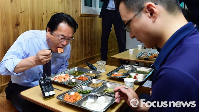 (서울=포커스뉴스) 정진석 새누리당 원내대표가 25일 서울 여의도 당사 앞 경비 의경대를 격려차 방문해 식사를 하고 있다.