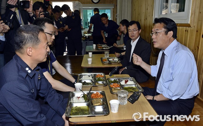 (서울=포커스뉴스) 정진석 새누리당 원내대표가 25일 서울 여의도 당사 앞에서 근무하는 경비중대를 격려 방문해 의경들과 오찬 간담회를 하고 있다.