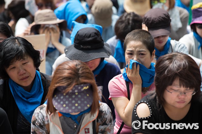 (서울=포커스뉴스) 25일 오전 서울 중구 서울시청 앞에서 열린 발달장애인 종합대책요구 무기한 삭발투쟁 2일차 기자회견에서 서울시 장애인 부모회 회원들이 눈물을 흘리고 있다.