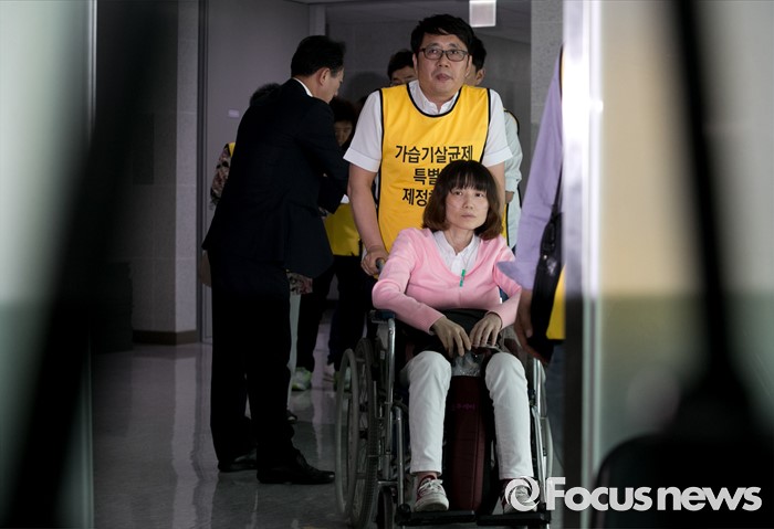 (서울=포커스뉴스) 가습기 살균제 피해자와 가족모임이 25일 오후 서울 여의도 국회 의원회관에서 박지원 국민의당 원내대표와 면담을 위해 이동하고 있다.